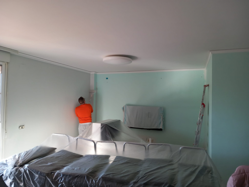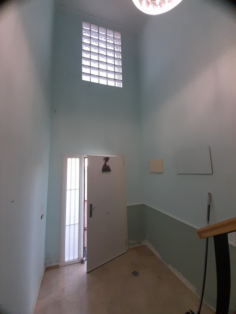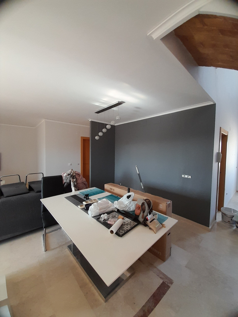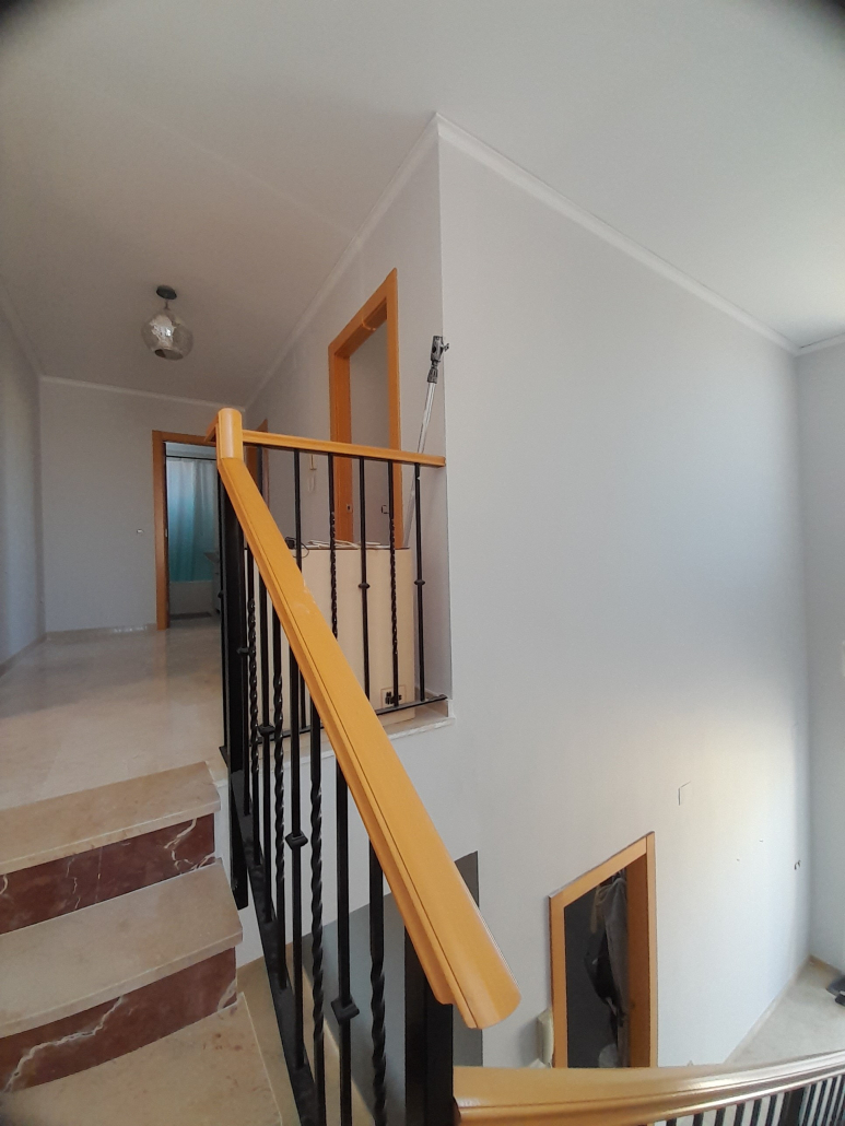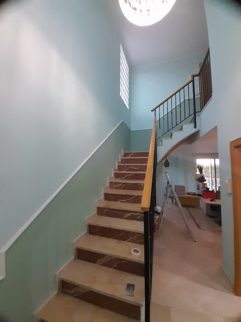 Pintura interior con cambio de decoración, aplicación de masilla de renovación Sika, Montaje andamio de dos modulos por la altura de la entrada del chalet. El resultado salta a la vista.