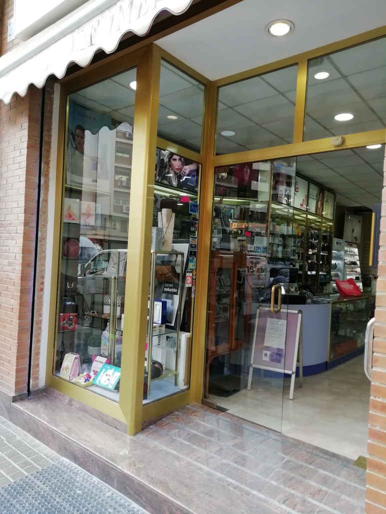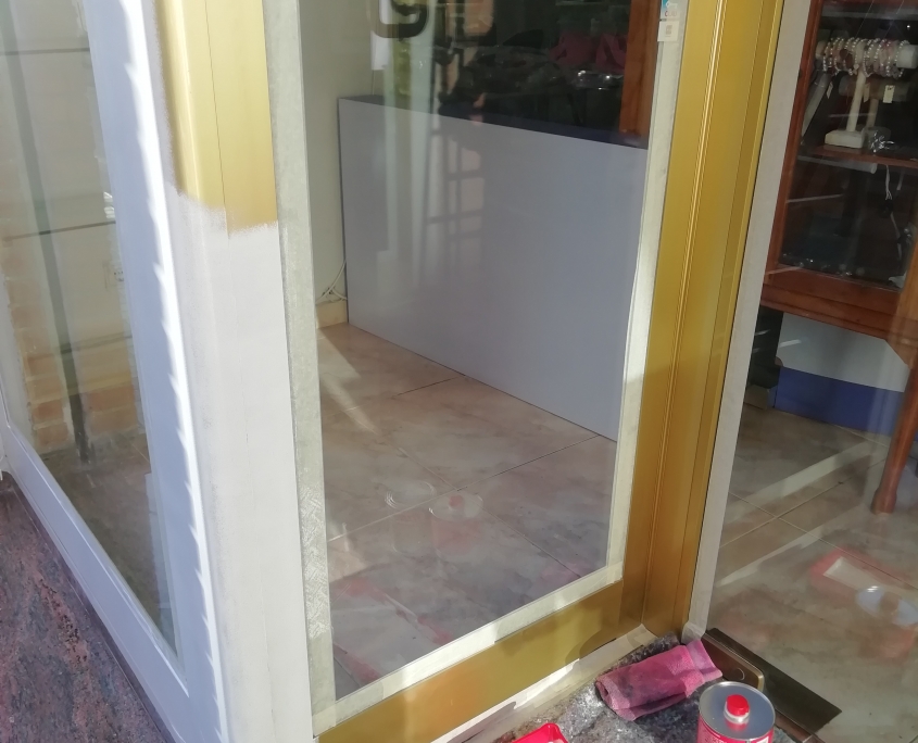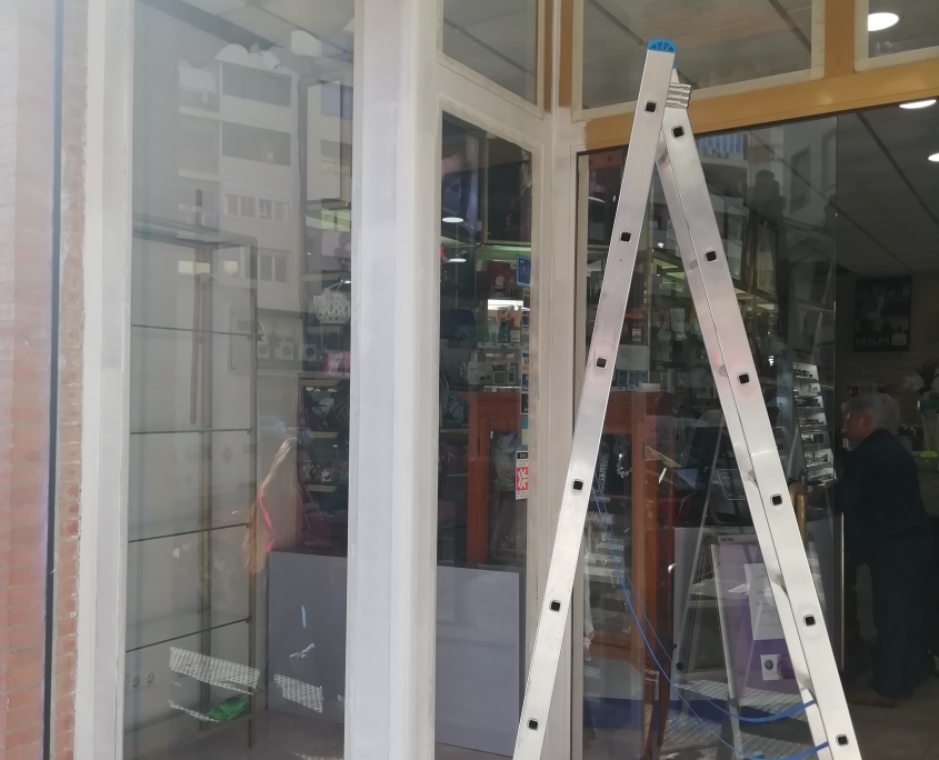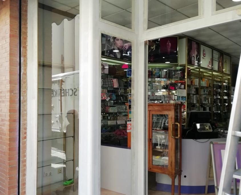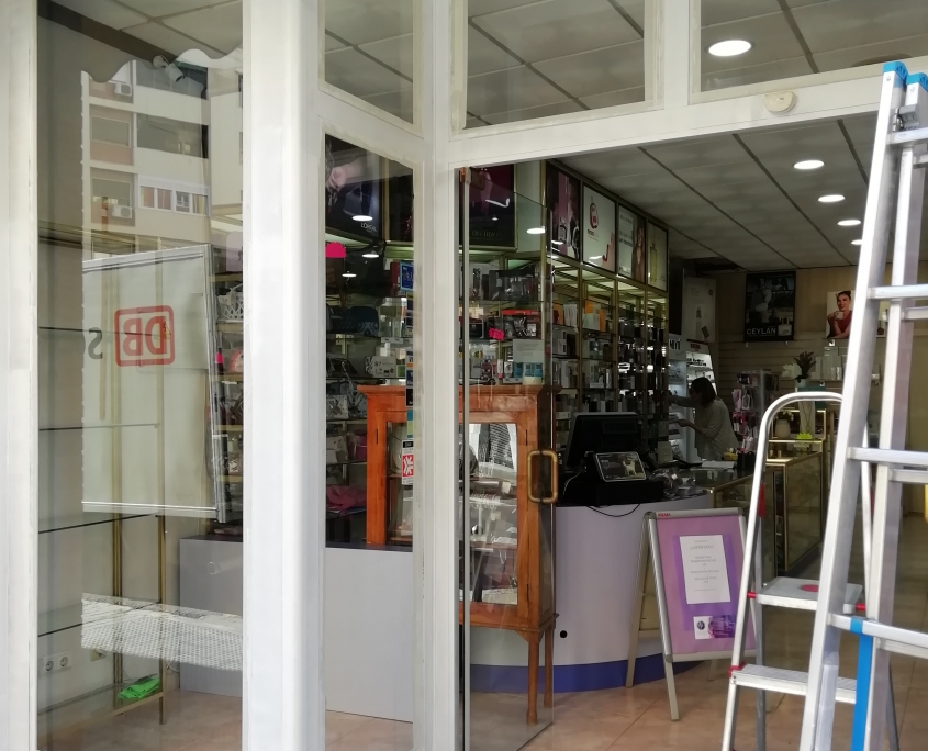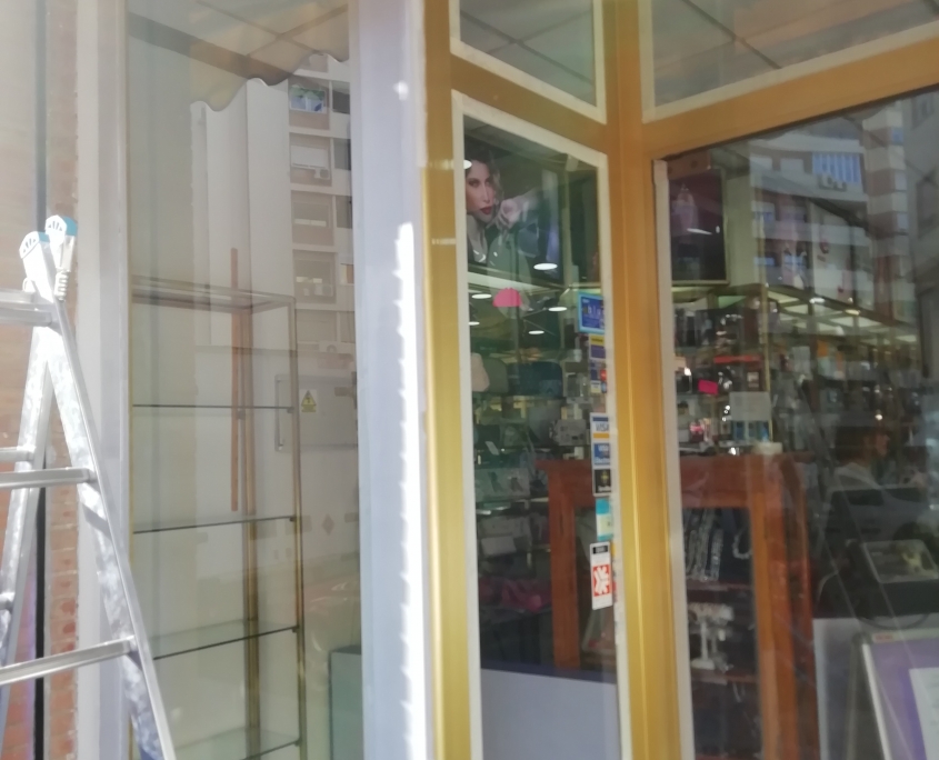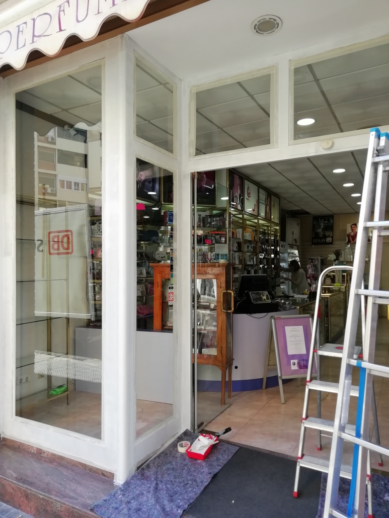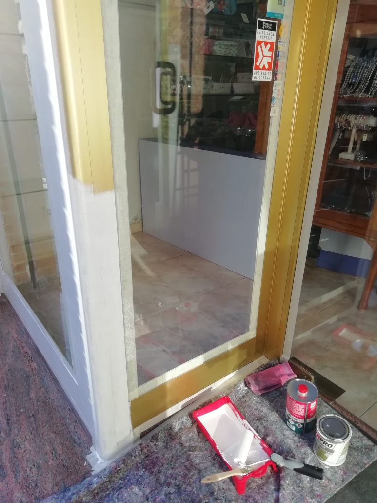 El cliente nos comenta que esta harto de llegar a su tienda y ver el escaparate en dorado, que le facilitáramos información y precio. Nuestra recomendación fue que lo pasara a un blanco mate, previamente aplicar una imprimación también en blanco. El resultado salta a la vista.