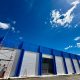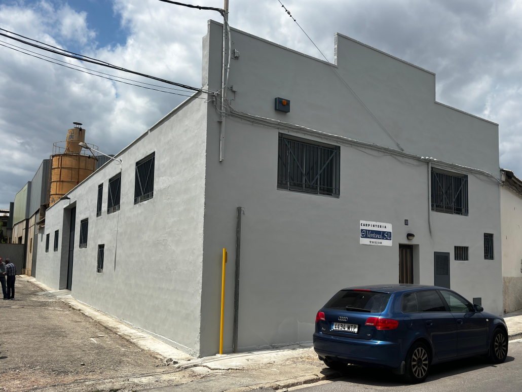 Fachada exterior de nave industrial incluyendo reparación de la puerta principal con imprimación y esmalte junto con todas las ventanas, aplicación de mortero en paredes exteriores y revestimiento.