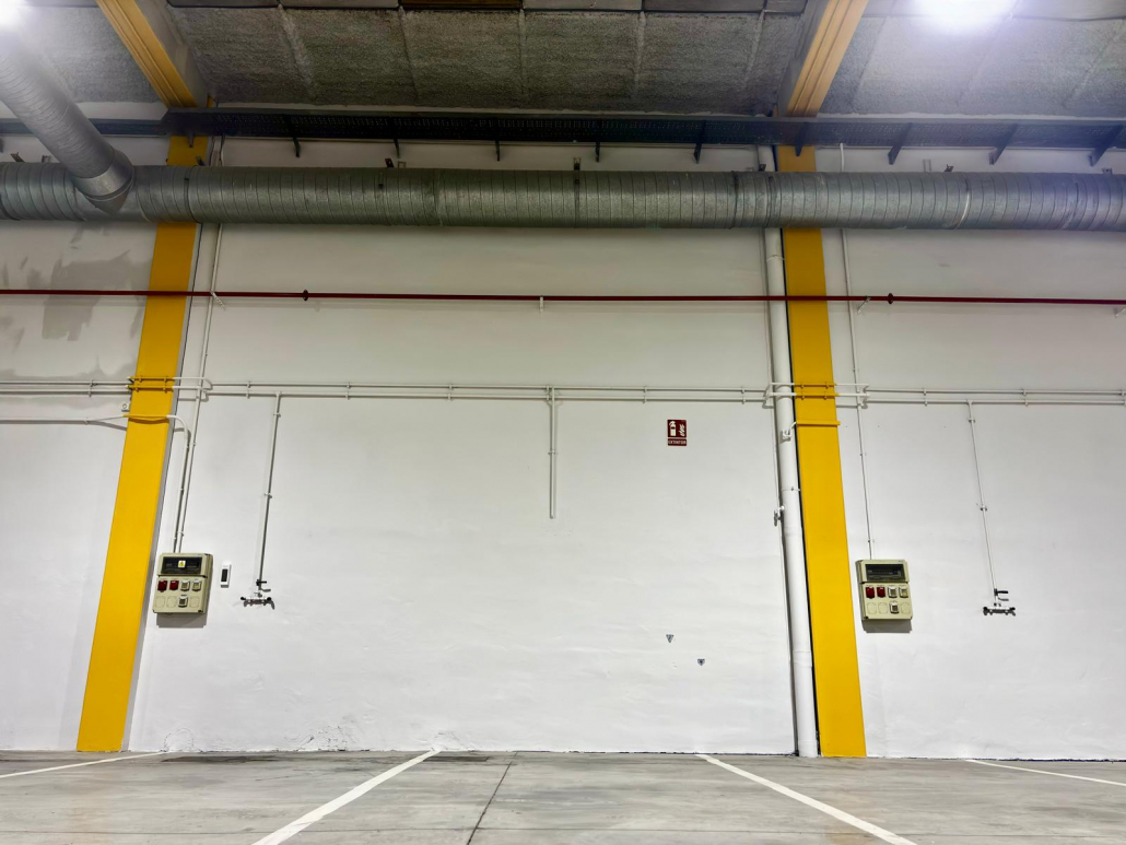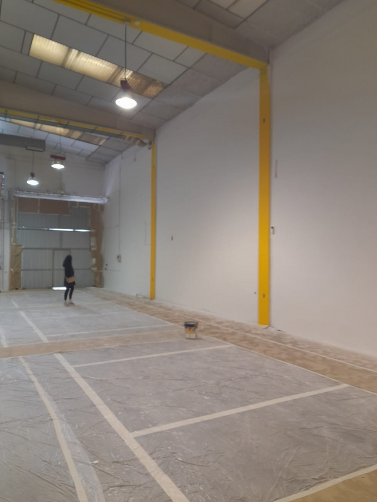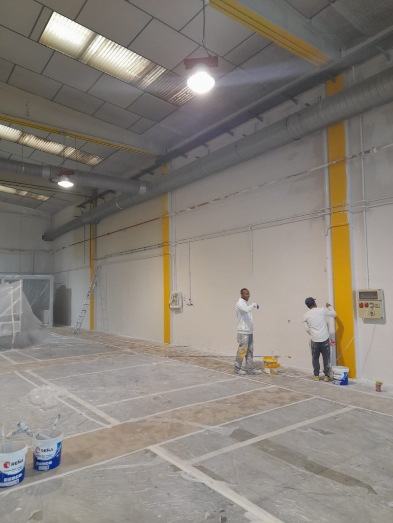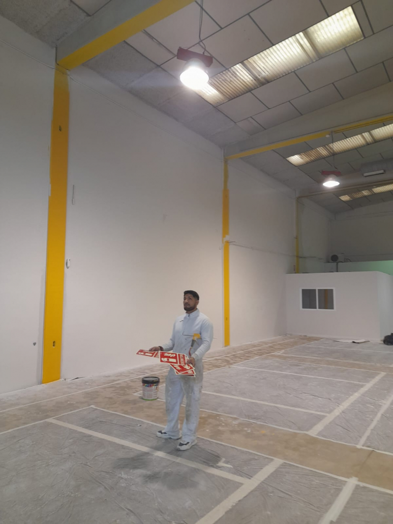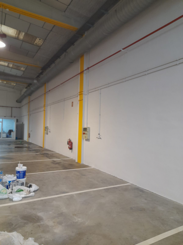 Pintor de naves industriales Valencia. Trabajo realizado con equipo Airless Graco. Combinación de tonos en piedra y pilares en naranja. Previa reparación con masilla e imprimación. Contento el cliente y nosotros también.