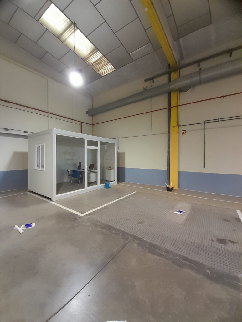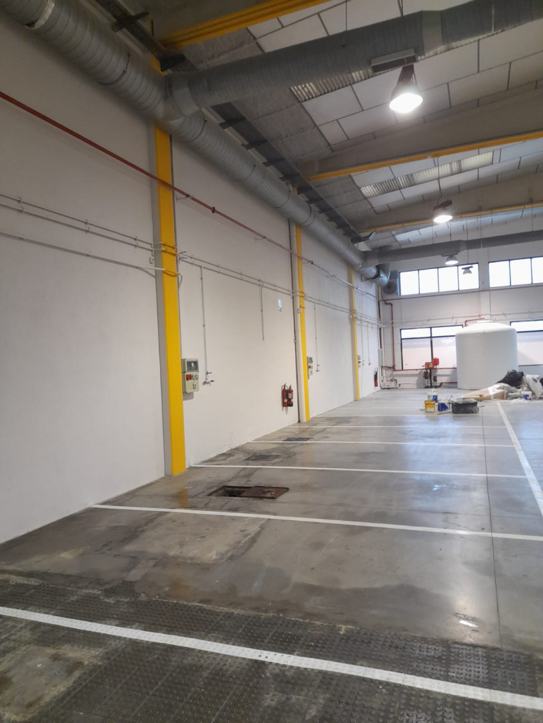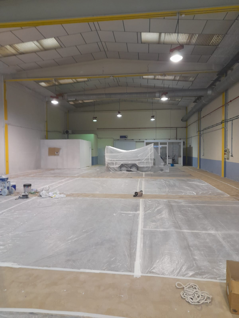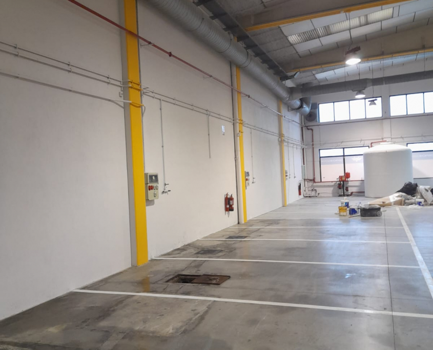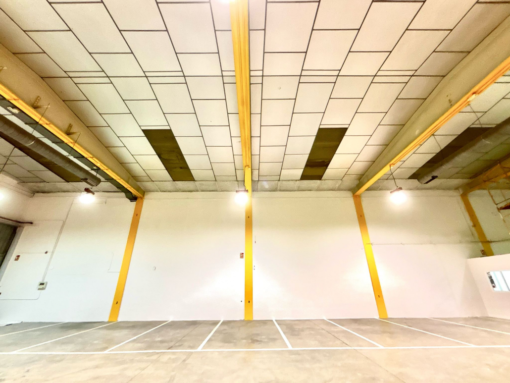 Pintor de naves industriales Valencia. Trabajo realizado con equipo Airless Graco. Combinación de tonos en piedra y pilares en naranja. Previa reparación con masilla e imprimación. Contento el cliente y nosotros también.
