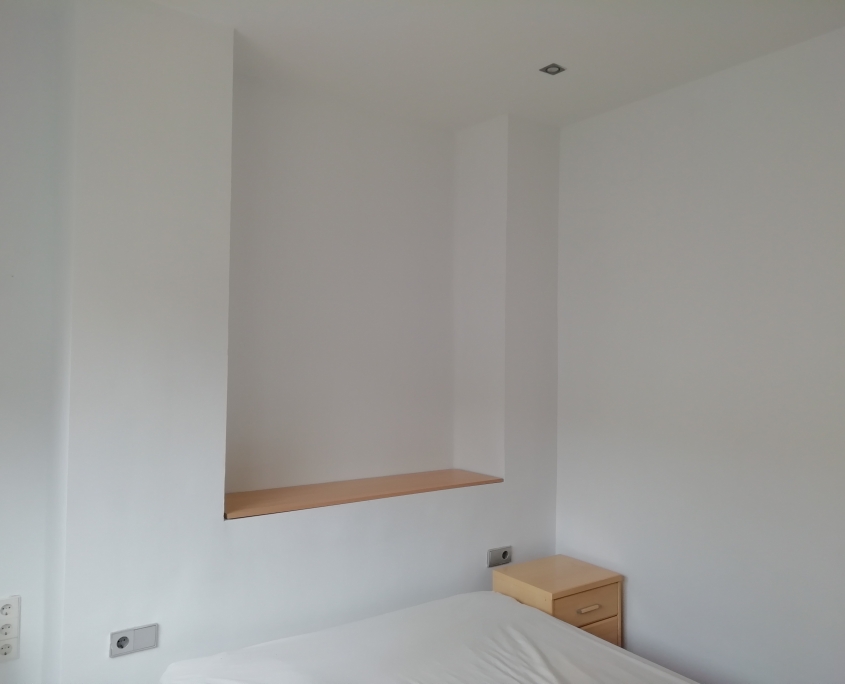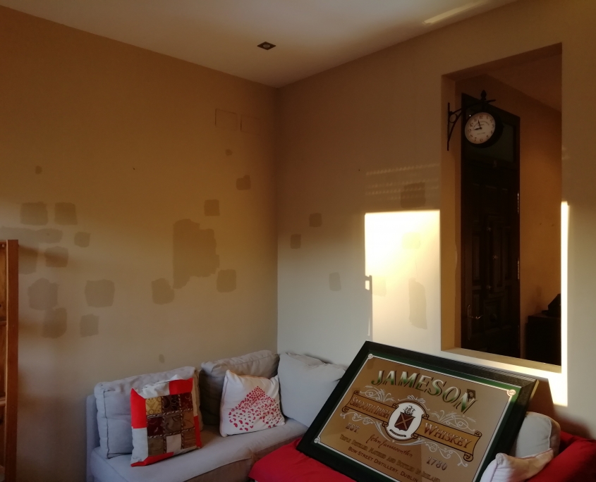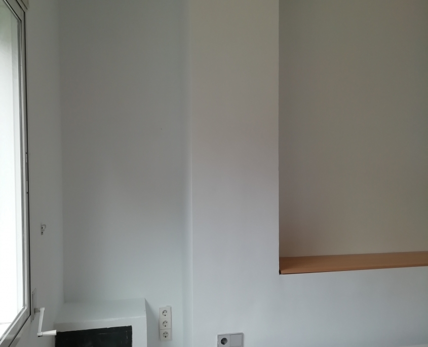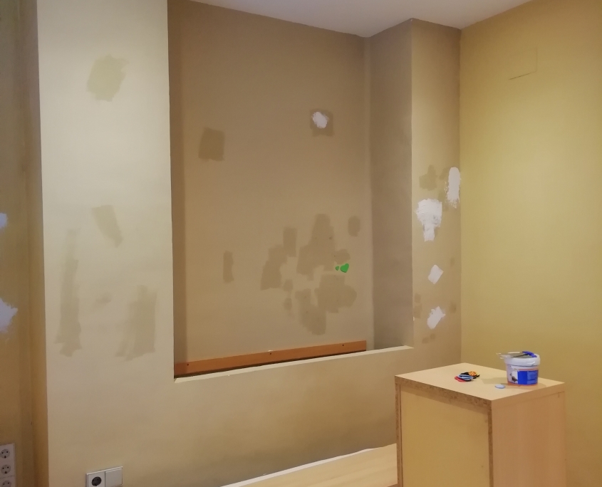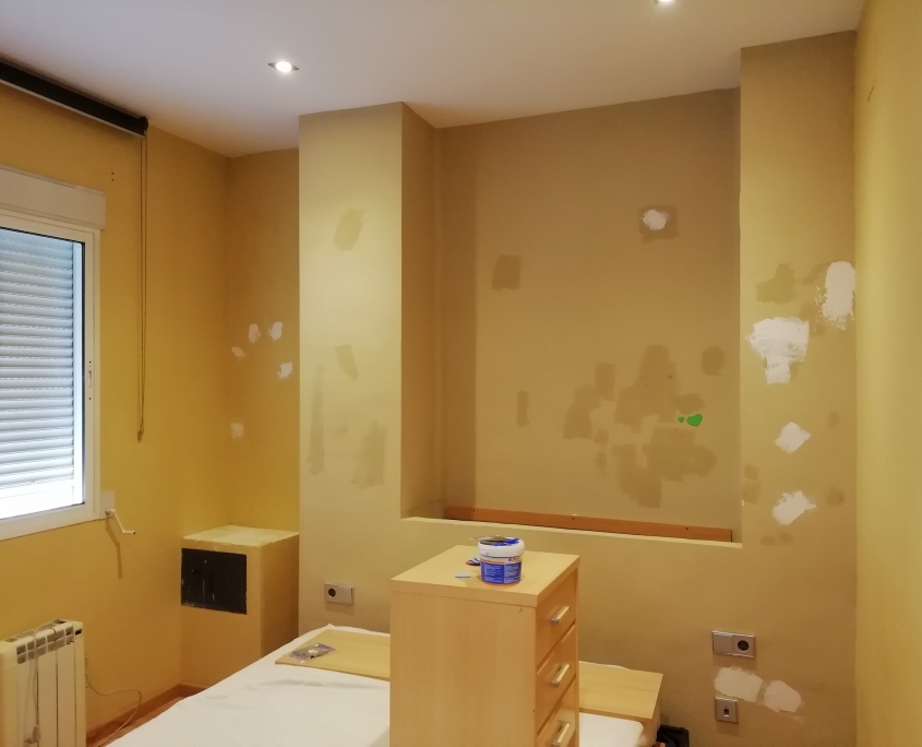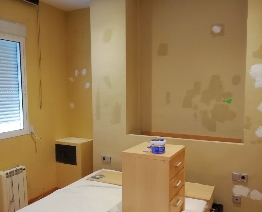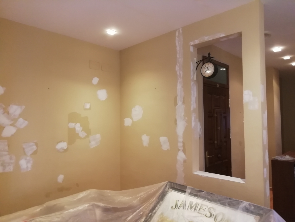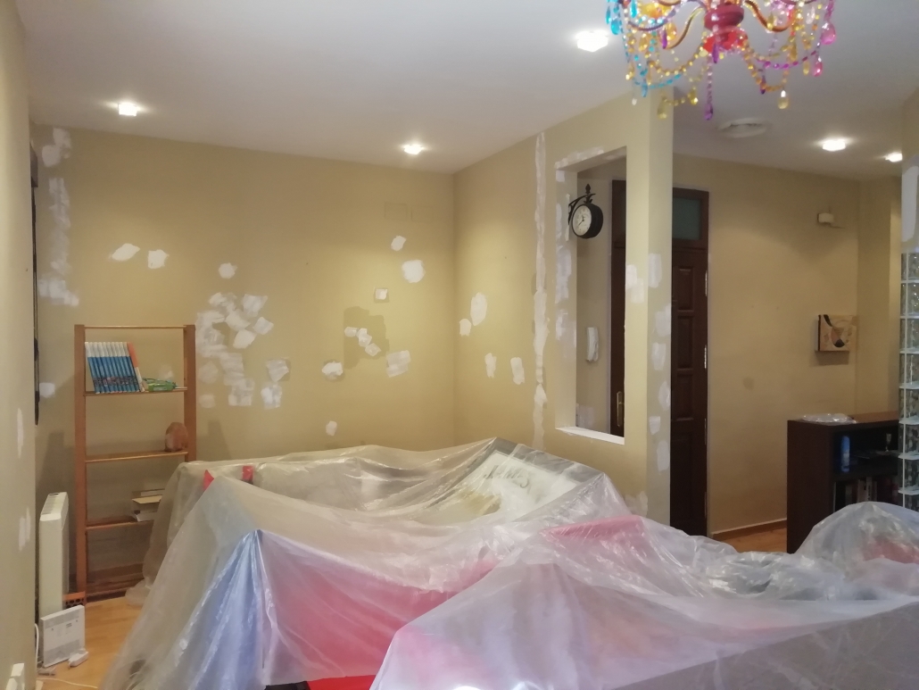 Reparación de paredes con masilla de renovación y pintura integral del piso en blanco mate.